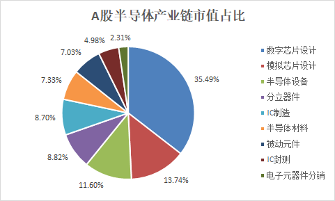 从市值来看,目前A股半导体产业链总市值为31832亿元,IC设计占据绝对的大头,数字芯片设计和模拟芯片设计市值之和占比近半。