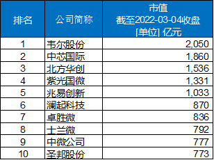 目前,在A股的半导体上市公司市值TOP10,超过1000亿的已经有5家了,去年这个时候只有3家。