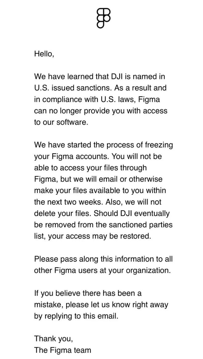 3月12号,根据多家媒体的报道证实,美国UI设计协作工具软件Figma已经封禁中国大疆,并封停所有被美国制裁名单的公司账号,也就是大疆和这些公司都不能再使用Figma公司的软件,此消息被大疆公司确认后迅速顶上热搜。