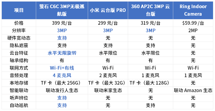 智能家居中摄像机占比超70%+,2019-2021 销售收入分别为14.8、20.2、29.4 亿元,占主营收比重 62.7%、65.8%、70.0%,主要代表产品室内云台系列、室外防水系列、卡片机系列、室外云台系列和电池相机系列。其产品性能领先,公司主推品质产品,在视频图像处理、音频处理、云台技术、智能化程度等方面,公司产品与竞品相比优势较为明显。同时,公司产品具备更大的存储容量支持和更多的联网方式选择。