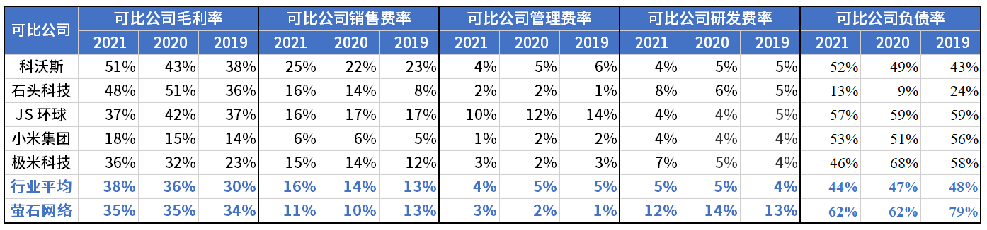 在同行业中,萤石网络毛利率居业内同类公司中位水平,保持稳定;销售费用率总体呈下降趋势,且低于多数可比公司;公司管理费用远低于行业平均水平,显示出公司良好的管理能力;研发投入方面,萤石网络近年研发支出不断增加,研发投入占营业收入的比例保持在 10%以上;资产负债率则高于同行业可比公司平均水平,公司偿债能力水平较同行业可比公司相对较低。