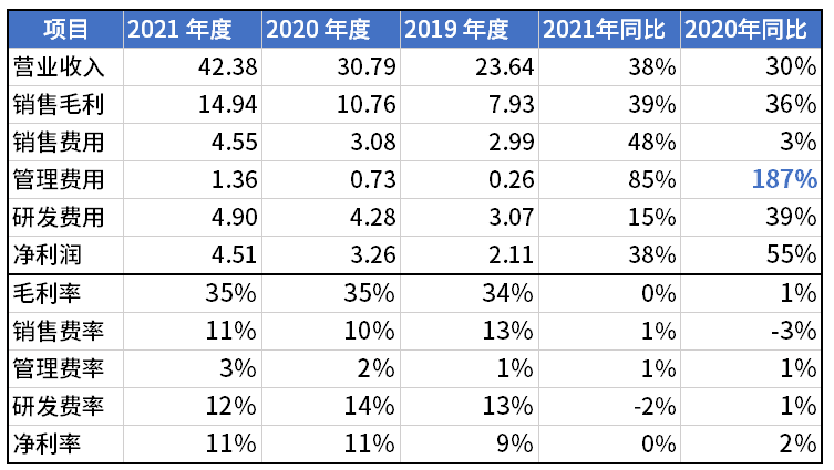 2019-2021,公司营收分别为 23.6 、30.8 、42.4 亿元,营收同比+54%、+30%、+38%。毛 利 率 分 别 为34%、35%、35%。净利润分别达2.1、3.3、4.5 亿元,增速分别达+62%、+55%、38%, 净利率分别为9%、11%、11%,盈利能力较强。其中2020 年度,公司管理费用较 2019 年增加了 4,775 万元(增速187%),主要系职工薪酬、股份支付费用增加。