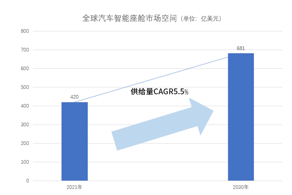 市场规模方面,根据IHS Markit数据,2021年全球智能座舱市场规模为420亿美元,预计到2030年将达到681亿美元。中国市场方面,2021年国内的市场规模占全球的比例为23%,金额为97亿美元。受益于我国新能源汽车的快速发展,预计未来我国智能座舱市占率将不断提升,到2030年占比将提升至37%至252亿美元,成为全球最主要的智能座舱市场。