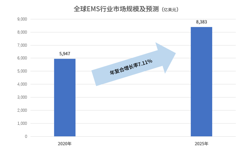经过多年的发展,EMS行业模式逐渐走向成熟。市场规模方面,根据New Venture Research的统计,2020年全球EMS行业市场规模达5,947亿美元,预计未来5年每年按照6~8%的速度在不断增长,到2025年全球电子制造服务收入将达到8,383亿美元,市场前景非常广阔。