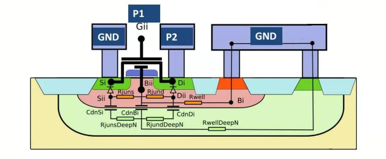 图:射频电路里晶体管衬底各种寄生效应的等效电路