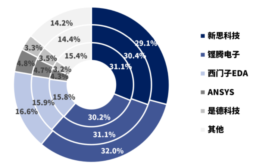 图:全球EDA市场份额,内圈至外圈分别为 2018-2020 年数据(资料来源:概伦电子招股说明书)