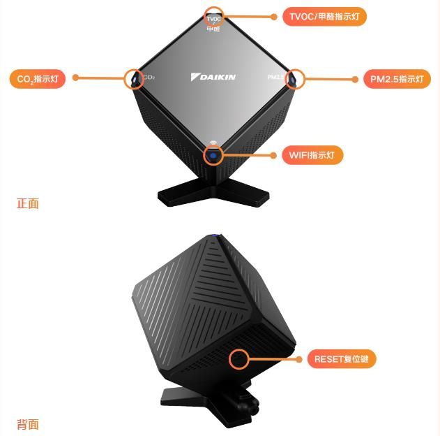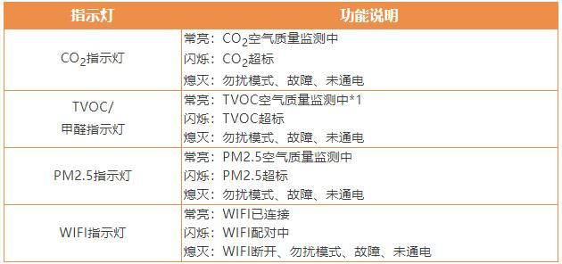 *1.如购买甲醛传感器选配件,常亮:TVOC,甲醛空气质量交替监测中,闪烁:TVOC或甲醛超标(具体超标对象请参考APP显示内容),熄灭:勿扰模式、故障、未通电。