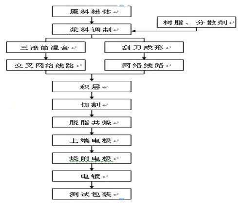 半湿式的生产方式其主要是在生胚薄片,以交叉厚膜网印的方式将内导线及材料的油墨印制成内部线圈的结构,在经积层、压合、切割、共烧等程序制成电感器,其制程如图一。此一制程的关键在于低温烧结低介电常数材料的粉体配方、生胚薄片与印刷油墨的制作与两者的性质、网版图案设计与网印条件设定、组件脱脂与共烧的温度曲线、端电极与电镀参数设定、组件测试。