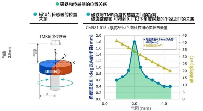 下图为在旋转轴上将传感器配置到距磁铁表面2.0mm的位置,不仅允许旋转轴有+/-1.8mm偏差,还能实现<0.1°的测量公差,适用于所有TMR角度传感器。