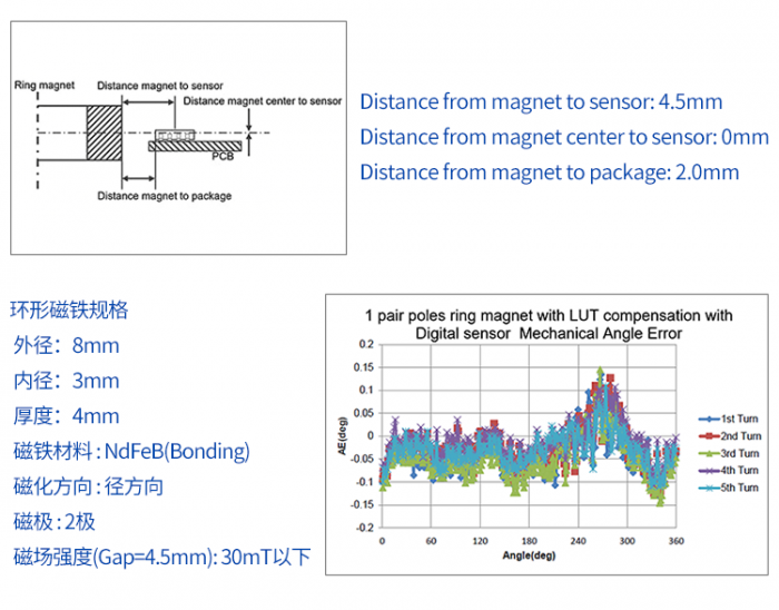 根据以下示例,使用单极对环形磁铁时,通过Lookup Table进行校正,角度误差可降至0.15°以下。