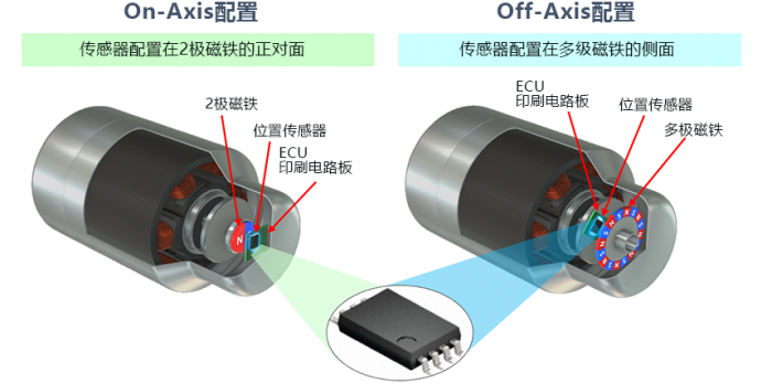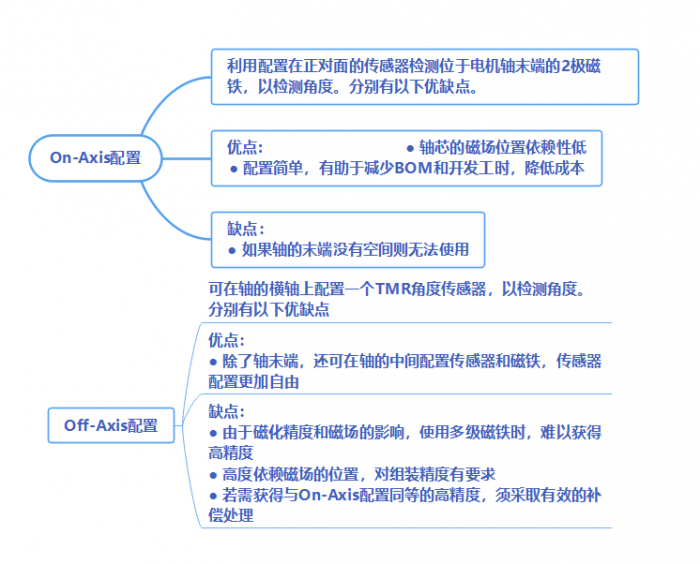 磁铁和TMR角度传感器的配置方法大致有两种:On-Axis(同轴检测/轴端检测)和Off-Axis(外周检测/侧轴端检测)。在两种配置中都能实现良好的角度精度,而多数情况下,建议先考虑On-Axis配置,若受到某些限制,再另行考虑Off-Axis配置。