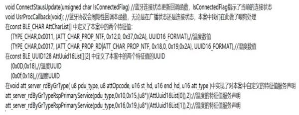 我们在gatt_user_send_notify_data_callback函数中给手机发送数据,该函数属于回调函数,协议栈会在系统允许的时候(异步)回调本函数,该函数可用于蓝牙模块端主动发送数据之用,函数内部不得增加阻塞代码。该应用中我们在此函数中实现将采集转换好的温湿度数据传输给手机APP。详细实现代码如下: