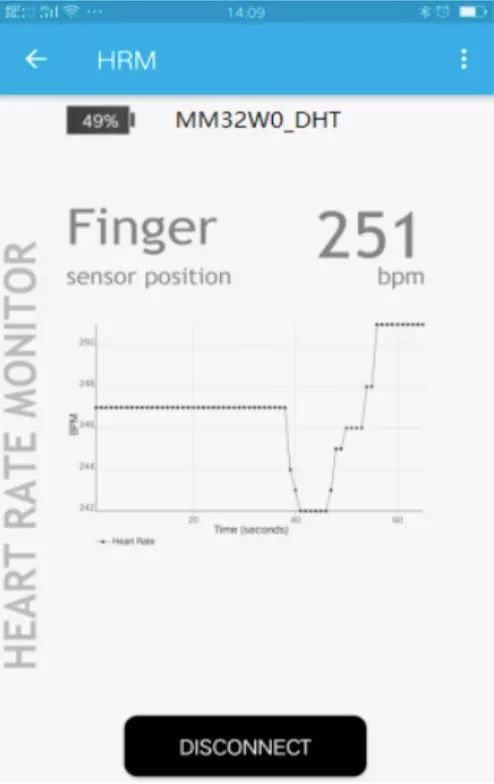 连接成功后,在App界面上电池图标会显示从DHT11传感器获取的湿度信息(百分比)Finger和图表会显示从DHT11传感器获取的温度信息(原始数据,温度值x10)。