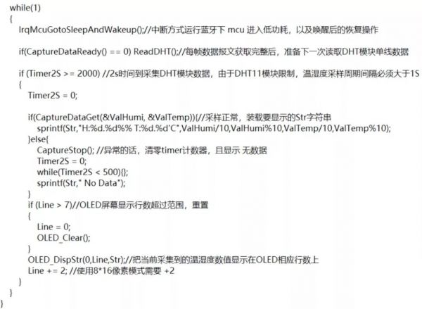 主函数的循环中主要实现的功能为定时采集和显示当前环境的温湿度数据,而该数据也将在蓝牙服务中发送到APP端显示,代码如下: