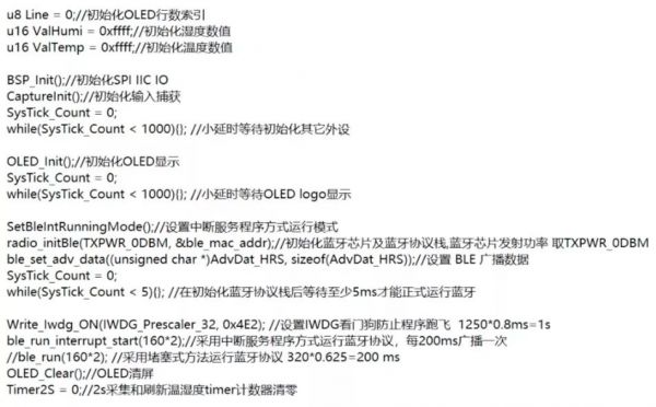 以下为主函数初始化配置内容,主要将所有的外设资源和蓝牙协议栈初始化,并且以中断服务程序的方式运行蓝牙,代码如下:
