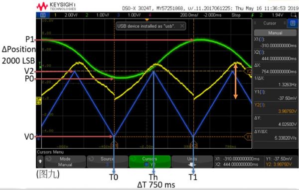 V(速度) ∝PWM 占空比,当速度过高则占空比会呈现Full duty 状态(如图九橘色箭头所标示占空比已接近满载)