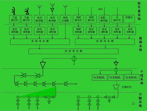 射频头主要用来转换信号。广播电视领域应用最为广泛。下图是电视广播信号传播系统,以有线电视为例,电视信号在干路上是用光纤来传播的,到用户家里,就需要用射频头将光纤线路里的信号解调成广播电视信号