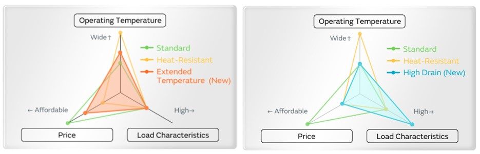 为了对应电子元件和IC的应用需求,村田“准耐热型”硬币型锂电池产品将工作温度范围扩大到−40℃至85℃*4。与“标准型”锂电池产品相比,该产品即使在85℃下存放100天以上也能保持高电压。与“耐热型”硬币型锂电池产品相比,该产品价格更低,实现了性价比优良的型号。以村田“准耐热型CR3677X”*5为例,该产品容量大,有助于实现电子设备的小型化和薄型化。