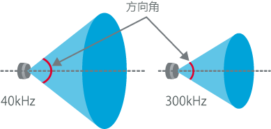 超声波传感器具有从顶部表面开始的圆锥形方向性,将方向性定义为从正面声压到-6dB。与光学传感器相比,方向性更宽,但是具有频率越高则方向性越尖锐的特征。