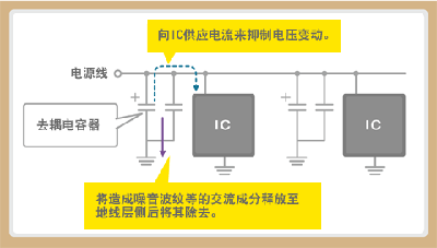 IC的电源线中并联连接有电容器。这是因为电源线中存在电路图中无法标识的阻抗,它会使电源电压发生变动,使电路错误工作或在电路间引起干扰。