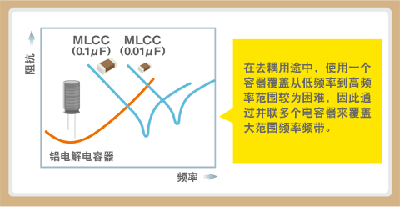 以往在模拟电路中,电解电容器与MLCC(积层贴片陶瓷片式电容器))会用于去耦而进行并联,但大容量MLCC实现产品化后,将电解电容器更换为MLCC的情况越来越多。