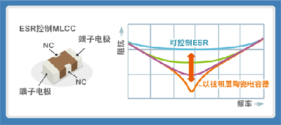TDK自行开发的全新ESR控制MLCC具有很好的效果。该电容器拥有与三端子贯穿型电容器相似的结构,其特点在于,通过与多个内部电极模式之间的组合改变积层体内的导体电阻值,实现将ESR设计为任意值。从而可实现在无需改变芯片尺寸、静电容量与耐电压等的情况下对ESR值进行更改的产品。