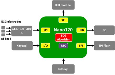 心电仪是一种医疗监测仪,使用在心律跳动不规则患者,分析心律跳动规律和提早确认心律跳动不规则,可预防心悸、心跳停止、休克。它必须包括一个超低功耗微控制器(MCU)、LCD显示器、实时时钟、数据保存、高精度24位ADC模拟数字转换器、和执行ECG演算法,将数据转换成心电图波形,实时显示在LCD显示器上、并且提供通用串行总线(USB)功能将数据上传到计算机、平板、智能手机。由于需要工作在非常低的功耗和长待机时间与电池供电,Nano120系列是适用应用于心电仪。