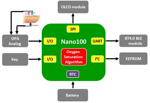 血氧仪是一种医疗监测仪,使用在血管疾病患者,呼吸系统疾病患者,老年人心肺器官老化者,用于测量血氧浓度(SpO2)和脉搏率。它必须包括一个超低功耗微控制器(MCU)、LCD显示、实时时钟、数据保存、执行血氧浓度演算法,和提供低功耗蓝芽BLE 4.0无线通信搭配App应用软件,将数据上传到计算机、平板、智能手机。由于需要工作在非常低的功耗和长时间待机与电池供电,Nano100系列是适合应用于血氧仪。