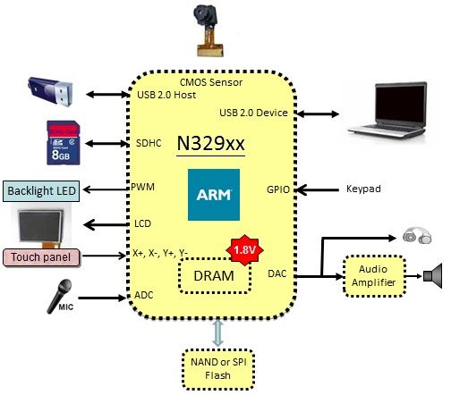 N329系列整合了数字录像机所需要的功能,例如: CMOS摄像头接口、硬件的影像编译码器、ADC、DAC、LCD控制接口、电视讯号编码器、SD卡接口、USB Host控制器和USB 2.0 Device控制器等,这使得N329成为高性价比的数字录像机应用芯片。此外N329更堆叠DRAM在同一个LQFP的封装,可以让PCBA能容易的通过EMI和EMC的测试。