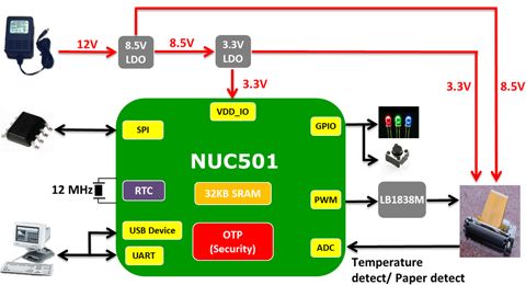 江南app公众号 NUC500系列主要特色为具有高性能、低成本、低功耗、32位ARM®的ARM7TDMI内核,内建32 KB/64 KB SRAM 可以有80MHz的速度,支持快速打印,并且有支持两组串口和USB连接装置。驱动更特别支持USB printer class方便计算机或是收款机打印。NUC500基本上是将打印机的功能全部集成在一个IC中,不但可以节省成本更可以用比较小的PCB来完成产品。基于上述特性,在打印机的应用中NUC500是一个非常高性价比的方案。