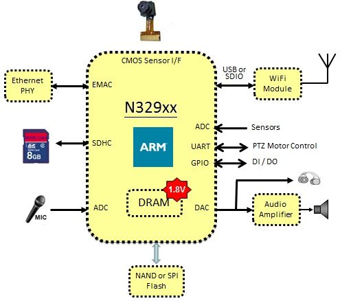 N329系列整合了无线网络摄影机所需要的功能,例如:CMOS摄像头接口、硬件的影像编码器、ADC、SD卡控制接口、和用于连接WiFi模块的USB Host控制器和SDIO Host控制器等,这使得N329成为高性价比的无线网络摄影机应用芯片。此外N329更堆叠DRAM在同一个LQFP的封装,可以让PCBA能容易的通过EMI和EMC的测试。