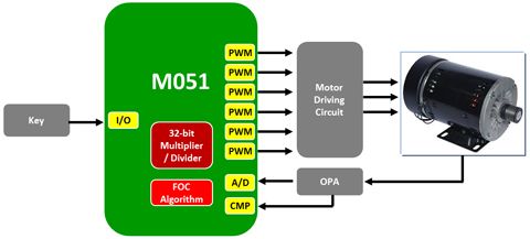风扇是利用马达将电能转变成风的装置。马达依种类可分交流马达与直流马达,而直流马达又分为有刷与无刷,直流无刷马达效能高于直流有刷马达。要驱动直流无刷马达需要三组具有互补式与死区功能的PWM输出、高速A/D转换器、比较器,因此NuMicro M051™系列适合应用在直流无刷马达风扇。