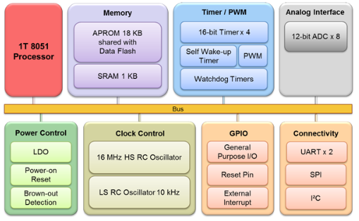 内存(memory) - 18 KB应用程序 Flash - 内嵌1 KB SRAM - 可配置的 Data Flash - 支持在线系统更新: | 模拟转数字转换器(ADC) - 12位8通道ADC - 每秒转换速率可达500 kSPS
