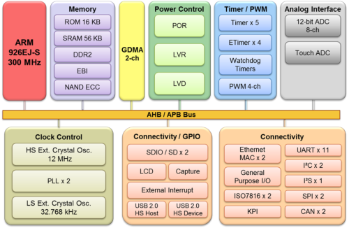· 内核(Core) – ARM926EJ-S核心 – 最高运行频率可达300 MHz – 16 KB指令高速缓存(I-cache)和16 KB数据高速缓存(D-cache) · 内存(DDR Memory) – 内建 64 MB记忆体 · 外部总线接口(EBI) – 可外接SRAM以及EBI相容装置 · USB 2.0 高速装置 – 提供两组USB接口:一组USB Host及一组USB Host/Device · 系统程序启动 (System Boot) – NAND Flash/ SPI Flash/ eMMC/ USB 装置 · 加密演算法(Crypto) – DES/ 3DES/ AES/ SHA/ HMAC/ PRNG | · 两组RMII介面10/100M以太网 · LCD控制接口 – 支持RGB565/ RGB666/ RGB888介面 – 最高分辨率:1024×600 · 影像输入 – 支持CCIR656/ CCIR601输入接口 – 最高分辨率:3百万像素 · 双SD Host介面 – 支持SD/ SDIO/ eMMC · 类比转数位转换器(ADC) – 支持12-bit 8通道 – 800 K 采样率(SPS) – 支持四线式电阻式触摸板 · 周边 – 支持SPI/ I2C/ PWM/ CAN/ ISO-7816 |