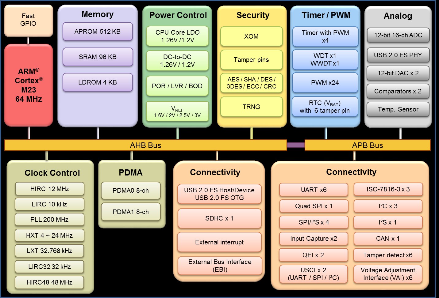 NuMicro® M263SIAAE 封装型式为 LQFP64 ( 7 mm x 7 mm )。同封装型式的脚位兼容让用户能够弹性地优化产品规格与效能。