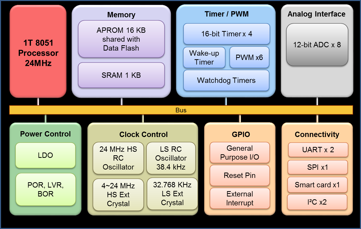 ML51UB9AE 包含 16 K 字节的 Flash 以及一个额外 1 K 字节片上辅助 RAM(XRAM), 备有丰富的外设,如 24 个通用 I/O、2 组串口、1 组 ISO-7816 界面、2 组 I2C 与 1 组 SPI,并提供 TSSOP28 封装。