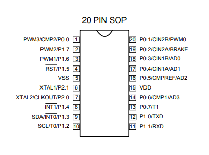 内核(core) -4T 8051微处理器 -工作频率可达 20 MHz -工作电压:2.7V to 5.5V -工作温度:-40℃ ~ 85℃ 内存(memory) -16 KB应用程序 -内嵌256B SRAM -256B Data Flash -支持在线电路编ICP(In-Circuit Programming) | 模数转换器(ADC) -提供4通道 -10位分辨率 -可达96 kSPS(每秒采样率) 通讯接口(connectivity) -一组I2C(可达 400 kHz) -一组UART 时钟控制(clock control) -外部晶振4 to 20 MHz -内RC晶振可配置6 MHz |