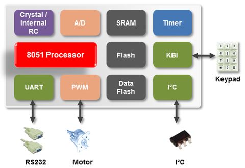 • 内核(Core) - 4T 8051微处理器 - 工作频率可达 24 MHz - 工作电压:2.4V to 5.5V - 工作温度:-40℃ ~ 85℃ • 内存(memory) - 4 KB 应用程序 - 内嵌512B SRAM - 4 KB Data Flash - 支持在线系统编程ISP(In-System Programming) - 支持在线电路编ICP(In-Circuit Programming) | • 模数转换器(ADC) - 提供4通道 - 10位分辨率 - 可达150 kSPS(每秒采样率) • 通讯接口(connectivity) - 一组I2C(可达 400 kHz) - 一组UART • 时钟控制(clock control) - 外部晶振4 to 24 MHz - 常温,5V下±1% 22.1184 MHz 内RC晶振 - 内RC晶振可配置22.1184或11.0592 MHz |