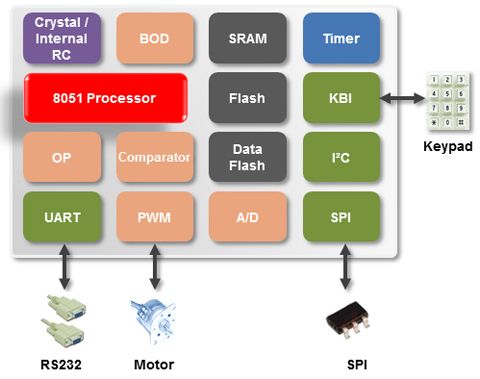 内核(Core) - 4T 8051微处理器 - 工作频率可达 40 MHz - 工作电压:2.4V to 5.5V - 工作温度:-40℃ ~ 85℃ 内存(memory) - 8 KB应用程序 - 内嵌512B SRAM - 128B Data Flash - 支持在线电路编ICP(In-Circuit Programming) 模数转换器(ADC) - 提供8通道 -10位分辨率 - 可达588 kSPS(每秒采样率) - 可与PWM同步触发 | 脉宽调制器(PWM) - 三对互捕PWM带死区产生器 -六通道控制for BLDC应用 - 二路煞车 通讯接口(connectivity) - 一组SPI(可达2.5 MHz) -一组I2C(可达 400 kHz) - 一组UART 时钟控制(clock control) - 外部晶振4 to 40 MHz -常温,3V下±2% 22.1184 MHz 内RC晶振 - 内RC晶振可配置22.1184或11.0592 MHz |
