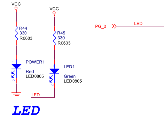 首先看一下LED1的连线情况,如图6所示,说明只要能控制PG_0即可让LED1动起来。