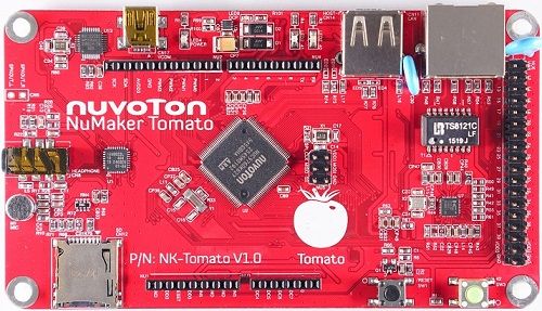 新唐NuMaker Tomato是一款精简、开源硬件架构,核心搭配新唐32位ARM926EJ-S NUC976DK62Y 处理器与Linux 操作系统为主的单板计算机,运作频率可达300 MHz,内建64MB DDR2 RAM,搭配新唐 NAU8822 Audio Codec,特别适合用于音讯处理;提供完整丰富的接口,包含10/100Mbps以太网络接口、Micro SD 卡槽、麦克风输入、3.5mm耳机接头、支持两组USB 2.0高速Host,以及Arduino兼容的接脚等。Tomato 非常适合创客创作各种物联网应用。