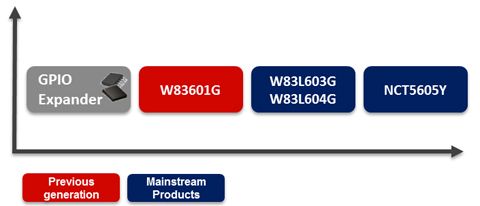 新唐通用型I/O扩展器具备SMBus和I2C接口,支持多组输出入引脚。 除了提供侦测输入引脚讯号的变化以发出中断通知系统,亦提供可程序化的LED输出及可程序化的蜂鸣警报声。此类IC广泛使用在云端运算(Cloud Computing)、台式计算机(Desktop)、笔记本电脑(Notebook)、服务器 (Server)、显卡(VGA Card)、投影机(Projector)、游戏机(Game Console)等各种应用。