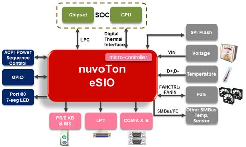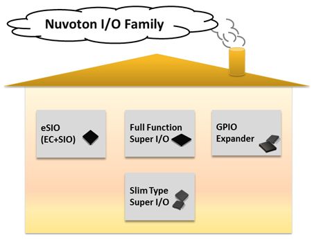 新唐eSIO系列产品内建嵌入式微控制器以及传统输出输入设备。由软件的支持不仅可以实现传统超級I/O(Super I/O)的功能,更可以达到功能的客制化以及差异化。新唐的eSIO系列产品被广泛应用在高端个人计算机、一体机(AIO)、工作站以及入门级服务器。