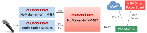 本方案采用 NuMaker-IoT-M487 平台,基于深度学习技术与关键词识别 (KeyWord Spotting) 方法进行语音识别,识别结果可做为智慧电源管理器开关控制。