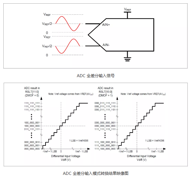 如图「ADC 全差分输入信号」所示,在全差分输入模式下,测量值是两个输入信号之间的差值,两个输入信号必须为 180° 反相信号,并固定共模电压为 VREF/2。由于一个输入管脚被定义为正输入管脚 (AIN+) 而另一个被定义为负输入管脚 (AIN-),因此根据哪个输入信号更高,差值可以是正的或负的。如「ADC 全差分输入模式转换结果映像图」所示,当 DMOF(ADC_ADCR [31]) 设置为 1 时,转换结果是以二的补码码形式表示的有符号数,或者当 DMOF(ADC_ADCR [31]) 设置为 0 时,转换结果是以二进制格式表示的无符号数。