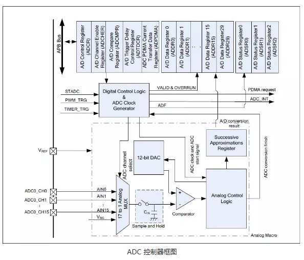 M031/ M032 内建逐次逼近式模拟数字控制器 (SAR ADC),支持 12 位分辨率,每秒可实现两百万次采样 (Msps)。内建模拟多任务器 (Analog Multiplexer), ADC 输入信号可选择从外部管脚或者内部电压。利用 PDMA 功能,ADC 可以在没有 CPU 参与的情况下运行,执行最大采样率,最小化系统电流消耗,或允许 CPU 执行其它工作项目。