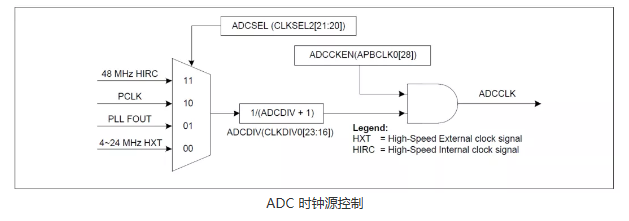 ADC 时钟频率 (ADCCLK) = (ADC 时钟源频率) / (ADCDIV + 1);其中 M031/ M032 ADC 时钟频率 (ADCCLK) 最大值为 34 MHz。使用者可以透过 PLL 倍频,产生 34 MHz 或者 68 MHz 频率。将 PLL 设定为 ADC 时钟源,并透过 ADCDIV 除频产生 34 MHz,即可让 ADC 运行在最高速度。