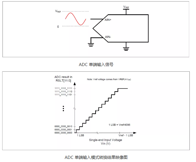 如图「ADC 单端输入信号」所示,在单端输入模式下,AVSS 或者 VSS 为 ADC 负端输入的信号 (AIN-),外部输入电压为 ADC 正端输入的信号 (AIN+)。如「ADC 单端输入模式转换结果映像图」所示,在 0V 和参考电压 (VREF) 之间,切分出微小电位阶。其数字结果以 0 到 4095 的无符号数,表示输入电压位于 0V 和参考电压 (VREF) 之间的位置。