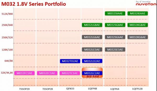 Nuvoton NuMicro® M032 全系列提供多样的封装,从 TSSOP20 (4.4mm x 6.5mm)、TSSOP28 (4.4mm x 9.7mm)、QFN33 (4mm x 4mm)、LQFP48 (7mm x 7mm) 与LQFP64 (7mm x 7mm) 封装、更支持 LQFP128 (14mm x 14mm) 封装。