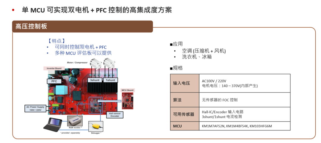 - MCU 算力可支持双电机驱动同时实现高频PFC控制。